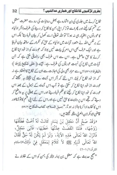 Mafroor Larkiyon Ka Nikkah Aur Hamari Adalatien offers scholarly references from the Qur’an, Hadith, and Fiqh to present a balanced and authentic viewpoint on the legality of such marriages. It also critiques how the courts handle these cases, pointing out the challenges, contradictions, and the need for alignment with Shariah principles. Mafroor Larkiyon Ka Nikkah Aur Hamari Adalatien is highly beneficial for students of Islamic law, legal practitioners, and readers who wish to understand the complexities of marriage-related cases in light of Islam and modern judiciary.